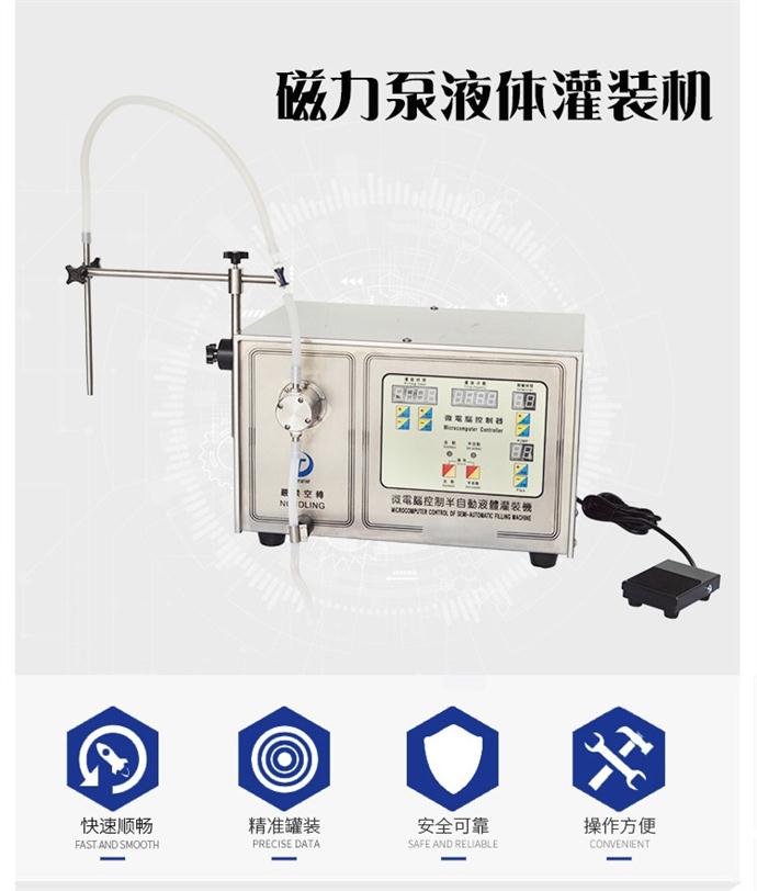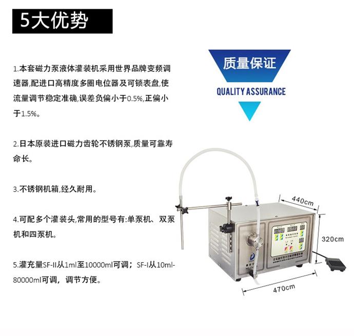 磁力泵液體灌裝機磁力泵式半自動液體灌裝機 名稱型號: 磁力泵灌裝機 SF-II型 主要用途 可灌充絕大類型的液體,包括高粘稠度的液體。如:各種藥劑、化學品、油類、化妝品、食品等無顆粒狀液體;灌裝精度高